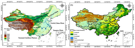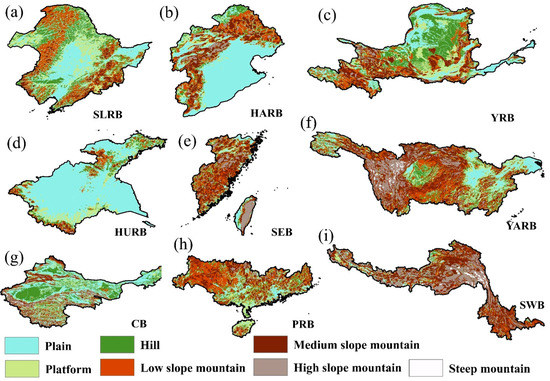 Map of the landforms in the SLRB (a), HARB (b), YRB (c), HURB (d), SEB (e), YARB (f), CB (g), PRB (h), and SWB (i) river basins. The topography data were provided by the Recourse and Environment Data Cloud Platform http://www.resdc.cn/ (accessed on 23 May 2022).