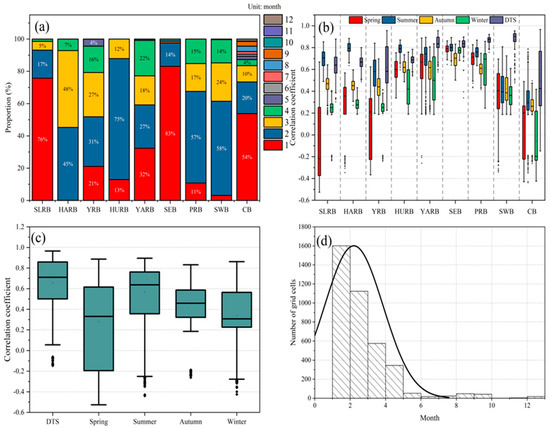 From Figure 2b, we found that the propagation relationship generally showed higher and lower correlation coefficients from meteorological to hydrological drought in northwestern and southern China, respectively. As shown in Figure 3b, the different timescales (DTS) correlation coefficients had higher values (approximately 0.80–0.90) in the YARB, SEB, PRB, and SWB; the DTS correlation coefficient had lower values (approximately 0.30–0.80) in the CB; and the DTS correlation coefficient showed higher (approximately 0.80–1.00) and lower (approximately −0.15–0.40) values in the southern and northern CB, respectively. However, the DTS correlation coefficient was between 0.50 and 0.80 in the SLRB, HARB, YRB, and HURB. The DTS correlation coefficient had higher (approximately 0.60–1.00) and lower (approximately 0.20–0.60) values in the eastern and western regions, respectively. In Figure 3b, in general, there were strong drought propagation relationships in different river basins of China in summer and autumn. However, there were weaker propagation relationships in spring and winter. In summer, the correlation coefficient (approximately 0.45–0.85) showed a strong propagation relationship from meteorological to hydrological drought for the SLRB, HARB, YRB, HURB, YARB, SEB, and PRB; however, the correlation coefficient (approximately 0.25–0.50) showed a weak propagation relationship for the SWB and CB (western China). In autumn, the correlation coefficient (approximately 0.50–0.75) showed a strong propagation relationship from meteorological to hydrological drought for the HURB, YARB, SEB, and PRB (southeastern China); however, the correlation coefficient (approximately 0.20–0.50) showed a weak propagation relationship for the SLRB, HARB, YRB, SWB, and CB. In spring and winter, the correlation coefficient showed a weak propagation relationship from meteorological to hydrological drought for the SLRB, HARB, YRB, and CB (northern China); however, the correlation coefficient showed a strong propagation relationship for the HURB, YARB, SEB, PRB and SWB (southern China). Figure 3c,d show the statistical results of the correlation coefficient and propagation time in mainland China. It is seen in Figure 3c,d, that the relationship between meteorological drought and hydrological drought was stronger in summer and autumn than in spring and winter. The drought propagation time was mainly 1–3 months. Meanwhile, the propagation relationship between meteorological and hydrological drought was shown to be stronger (correlation coefficient about 0.50–0.85) in different timescales.