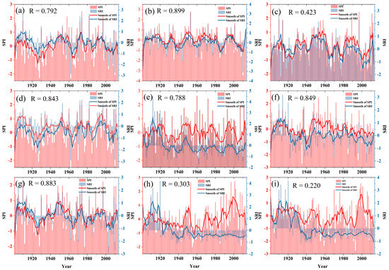 Annual change in the SPI and SRI during 1902–2014 in the SLRB (a), HARB (b), YRB (c), HURB (d), YARB (e), SEB (f), PRB (g), SWB (h), and CB (i) river basins. R represents the correlation coefficient between the SPI and SRI on an annual scale.