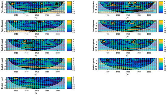 In Figure 5, in general, meteorological and hydrological drought had an evident positive relationship in the SLRB, HARB, YRB, HURB, YARB, SEB, and PRB; however, meteorological and hydrological drought had no significant positive relationship in the SWB and CB. The relationship varied among different river basins in China. The relationship of drought propagation occurred at a larger timescale (more than 32a) in the SLRB, HARB, YRB, HURB, YARB, and SEB. Moreover, the SLRB, HARB, YRB, HURB, YARB, and SEB had periodicity characteristics of larger timescales in 1935–2014, 1901–1980, 1901–1960, 1901–1995, 1901–1960, and 1901–1990, respectively. Drought propagation occurred on a large timescale (between 16a and 32a) in the HARB, HURB, YARB, SEB, and PRB. Moreover, the HARB, HURB, YARB, SEB, and PRB had periodicity characteristics of large timescales in 1955–2010, 1955–2005, 1940–1955, 1955–2005, and 1925–2014, respectively. In Figure 5b,d, the HURB and HURB had similar periodicity characteristics at different timescales; the relationship of drought propagation occurred on a small timescale (between 4a and 8a) in the HARB and HURB, which had a periodicity characteristic in 1920–1940 and 1995–2010; drought propagation occurred on a medium timescale (between 8a and 16a) in the HARB and HURB, which had periodicity characteristics in 1950–1985. Moreover, the SLRB also had a periodicity characteristic of a medium timescale (between 8a and 16a) during 1960–1980.