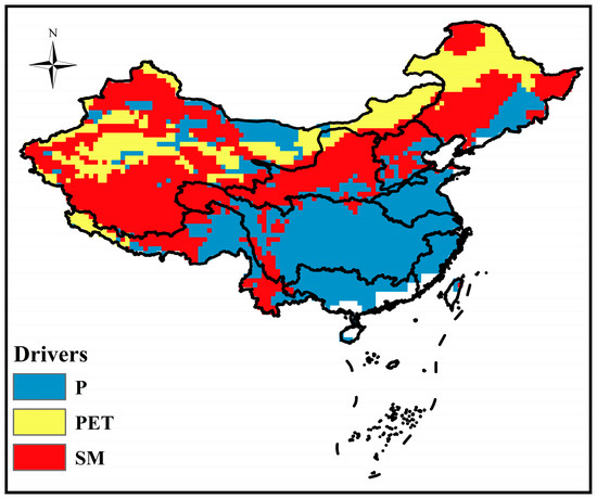 The primary driving factor of propagation from meteorological to hydrological drought in China. The drivers included P, PET, and SM.
