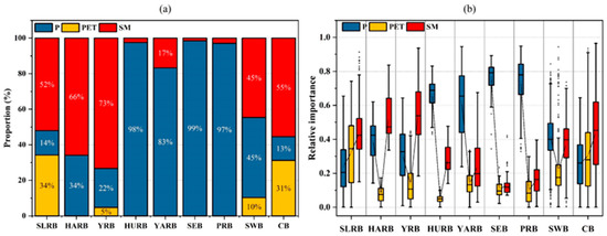 From Figure 7b, P (relative importance approximately 0.10–0.35), PET (approximately 0.10–0.50), and SM (approximately 0.30–0.60) displayed a similar relative importance in the SLRB and CB. Moreover, P (approximately 0.20–0.45), PET (approximately 0.05–0.20), and SM (approximately 0.40–0.70) displayed a similar relative importance in the HARB and YRB. However, P had a high relative importance in the HURB (approximately 0.60–0.70), YARB (approximately 0.40–0.80), SEB (approximately 0.70–0.82), and PRB (approximately 0.65–0.82). Both P (approximately 0.32–0.50) and SM (approximately 0.30–0.48) showed a similar relative importance in the SWB. In general, the SLRB and CB showed a similar relative importance of P, PET, and SM for the propagation from meteorological to hydrological drought; The HARB and YRB had a similar relative importance of driver factors; and P had the highest relative importance for the propagation of drought in the HURB, YARB, SEB and PRB.