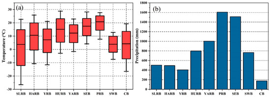 The monthly temperature (a) and annual average P (b) in 1901–2014 in different river basins.