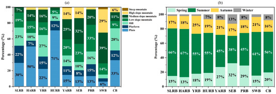 The proportion of topography (a) and seasonal precipitation (b) in different river basins. The proportion of seasonal precipitation in annual precipitation.