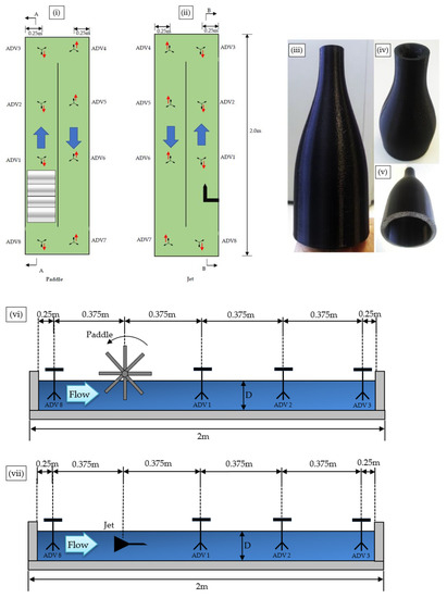 Previously, Salim et al. [6] used Nortek Vectrino Acoustic Doppler Velocimetry (ADVs) instruments to measure the three-dimensional instantaneous flow velocities to examine the turbulent bursting effect on sediment particles. In this study, Micro-acoustic Doppler Velocimetry (MicorADV by SonTek, San Diego, CA, USA) was employed to determine the flow field’s three velocity components in the PWP and JNP at eight points in each pond, as shown in Figure 1. The gadget uses a sample frequency of 10 Hz for 10 min at each location and is based on the Doppler effect’s physical theory. In all the paddle and jet trials, as shown in Figure 1, the ADVs were positioned 0.07 m above the bed. Notably, the sensors were spaced high enough from the bed so that they did not contact the bottom of the flume during the ADV’s data collection due to the physical dimensions of the devices [22]. For analysis purposes, near-bed ADVs data (at z = 0.07 m height above the bed) are used in this study.