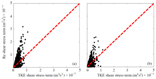 Contrast of the Reynolds and TKE shear stress term (one-second mean shown in black dots) from (a) JNP and (b) PWP experiments (for a twenty-five-minute period). The equality is defined by the dashed red line.