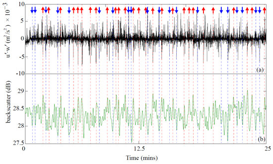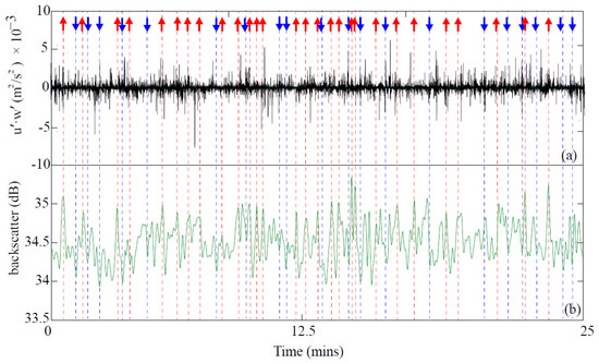 JNP experiment time series records: (a) turbulent Reynolds shear stress (u′w′) term, ejection showed in red up-arrows and sweep showed in blue down-arrows; (b) backscatter (in one-second mean).