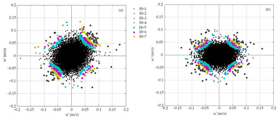 Contributions to u′w′, both for the JNP and PWP runs, were also detected in four quadrants of the u′-w′ plane (Figure 5), where hole (H) = 1, 2, 3, 4 are small-to-medium events, and H = 5, 6, 7 are algae mixing events (i.e., backscatter reading above 10 dB). The graphs undoubtedly demonstrated that u′ and w′ contributed far more to ejections and sweeps than to up-acceleration and down-deceleration occurrences. The presented outcomes are comparable with preceding studies for the resuspension process of near-bed, non-organic materials [20,43]. Other data sets from both the JNP and PWP analyzed in this study also showed similar results.