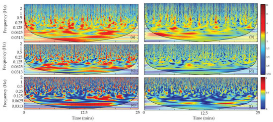 JNP and PWP experimental twenty-five-minute runs of wavelet power spectra (Morlet wavelet) showing the (a,b) momentum flux (u′w′), (c,d) microalgae mixing flux (c′w′), and (e,f) coherence between the momentum and algae mixing fluxes.