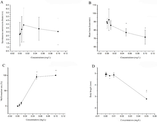 Sub−lethal effects of Hg2+ on rare minnow embryo and sac−fry stages. (A) frequency of spontaneous movement at 36 hpf; (B) heart rate at 48 hpf; (C) malformation rate at 96 hpf; (D) body length of larvae after exposure. * Significant difference from the control group (p < 0.05).