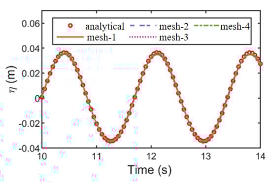 The left side of the numerical model calculation domain is the inlet, the right side is the outlet, the left and right walls are the slip walls, the top is the pressure outlet boundary condition, and the bottom is the fixed wall. The cylinder wall is set as the fixed wall for the fixed cylinder. The wall functions and are used to control the wall region, and the dimensionless wall distance should be kept between 1 and 300; in this paper it is 40. On the wall, the velocity is set as the Dirichlet boundary condition ( in three directions), and the pressure and volume fraction are set as the Neumann boundary condition. The atmosphere conditions at the top of the computational domain are mixed Dirichlet–Newman boundary conditions for velocity, pressure, and volume fraction. The Wave2Foam toolbox is used to set boundary conditions in the inlet and outlet. Firstly, the grid convergence of the empty wave flume is verified to reduce the calculation amount under the premise of ensuring sufficient accuracy. The length of the wave flume is 20.5 m. In order to eliminate the secondary reflection at the end of the flume and the structure, the relaxation regions at the front and rear ends are set to 1 times of the wavelength (4.5 m) and 1.5 times of the wavelength (7 m), respectively. The typical wave condition () is simulated under four different mesh schemes given in Table 1, where the time step is .