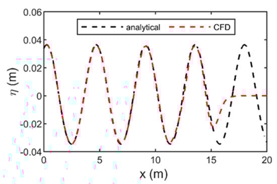 The simulation results are compared with the theoretical results. The time series of wave surface elevation is shown in Figure 3, and the wave height comparison is shown in Table 2. The results show that the wave height simulated by the second grid division scheme can achieve high accuracy. Figure 4 shows the comparison between the simulated instantaneous wave surface and the theoretical wave surface under Scheme 2. It can be seen that the simulated wave surface is basically consistent with the theoretical wave surface, and the wave absorption effect of the wave relaxation zone at the end of the flume is good. The grid division of the subsequent numerical simulation in this paper will be based on Scheme 2.
