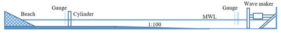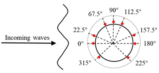 Based on the appropriate meshing scheme determined in Section 2.2.1, the interaction between wave and fixed cylinder is simulated in this section, and the results are compared with the experimental results to verify the accuracy of the CFD model to simulate the wave run-up phenomenon. As shown in Figure 5, the wave run-up of a fixed vertical cylinder was experimentally investigated by Vos et al. [11], which was conducted in a wave flume at Aalborg University, Denmark. In order to be consistent with the experiment, the dimension of the established numerical flume in Section 2.2.1 is modified, while the others are kept the same. Meanwhile, aiming to reduce the computation time, the length of the numerical flume () is also reduced compared with that of the experimental flume (). The size of the numerical wave flume is: , and the water depth is 0.5m. The diameter and height of the cylinder are and , respectively, located at the center of the two sidewalls, and the cylinder is fixed at the bottom of water. The wave conditions used in the simulation is the fifth-order Stokes wave with wave height , period , and wave steepness ( is the wave number, is the wave amplitude). Euler discretization is used for the time term, center discretization is used for the pressure gradient and dissipation terms, and the maximum Courant number is set to 1. Figure 6 shows the arrangement of numerical wave height measuring points, and nine measuring points are set on the surface of the cylinder to monitor the time series of wave run-up around the cylinder.