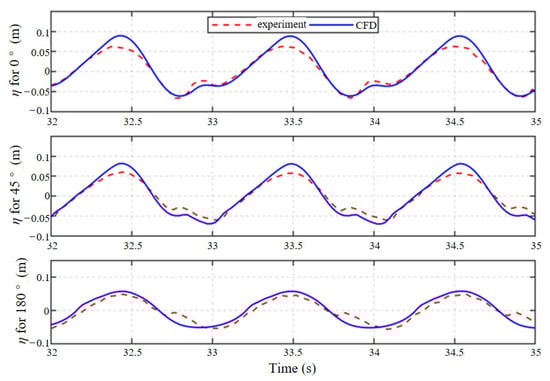 Figure 7 shows the comparison of wave run-up between the simulation and experiment at three measuring points at 0°, 45°, and 180° around the cylinder. The ordinate represents the wave surface elevation relative to the mean water level (), and the abscissa is time. The results show that the numerical simulation results are in good agreement with the experimental data. The maximum error of wave height is 15.2%, and the wave run-up height is consistent with the overall trend. The simulation results can also observe the quadratic peak phenomenon as the experimental results, which proves the accuracy of the model and lays the foundation for subsequent simulation. Numerical results sometimes overestimate the peak value of wave run-up. Devolder et al. [28] pointed out that this may be related to the reflection difference between numerical and experimental results, as well as the measurement technique of wave run-up height.