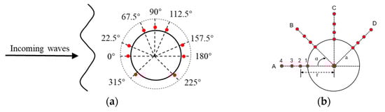 Based on the numerical model validated in Section 2, the interaction between thee wave and thee fixed truncated cylinder is numerically simulated to analyze the spatial distribution of wave run-up of truncated cylinders. Wave height measuring points are arranged in circumferential and radial directions, respectively, and the arrangement of circumferential measuring points is consistent with Figure 6. Distribution of radial measuring points are shown in Figure 8b. Sixteen numerical wave height measuring points are set up to monitor the variation and spatial distribution of waves along different radial directions of the cylinder. The distance and angle between radial measuring points are shown in Table 3. All incident waves propagate along the positive direction (i.e., the position of 0° measuring point).