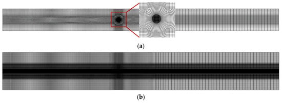 The numerical model is meshed by hexahedral structured grids, as shown in Figure 9. The boundary layer is divided at the boundary of the cylinder, and the surrounding is refined to meet the accuracy requirements of the simulation wave surface and force. The different mesh sizes have been used to verify the mesh convergence for wave–cylinder interaction, and the results presented in this paper are the verified results.