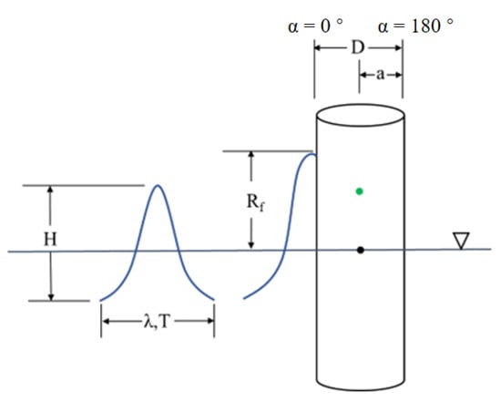 - Swan, C.; Sheikh, R. The interaction between steep waves and a surface-piercing column. Philos. Trans. R. Soc. Lond. Ser. A Math. Phys. Eng. Sci. 2015, 373, 20140114. [Google Scholar] [CrossRef]