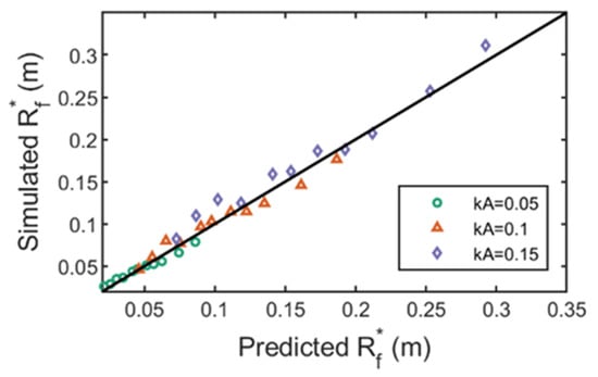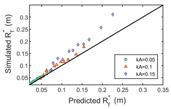 It can be seen from Figure 12 that the numerical simulation results are in good agreement with the estimation formula proposed by Bonakdar at al. [12]. The dispersion between the predicted value and the simulated value can be ignored, and the data points are basically concentrated on the 45° correlation line, indicating a good correlation. The consistency index 0.9941 and dispersion index 9.76% also show that the formula can accurately predict the wave run-up of a fixed truncated cylinder under regular waves. The reason is that the relative wave height, relative water depth, and slenderness ratio used as the control parameters of the maximum run-up height are of physical significance. They can represent the characteristics of incident waves, such as nonlinearity (), dispersion (), and diffraction region (). Figure 11 proves the accuracy of the numerical model and the numerical results; on the other hand, it also shows that, for the truncated cylinder with the draft reaching half of its height, its maximum wave run-up height is consistent with that of the fully bottom fixed cylinder. The draft has little effect on the maximum wave run-up height of the cylinder, and its maximum run-up height can also be predicted by the fixed vertical cylinder estimation formula. At the same time, for the estimation of the maximum run-up height of the vertical cylinder under the action of nonlinear waves, the formula proposed by Bonakdar et al. [12] is more accurate and close to the reality than the formula proposed by Vos et al. [11].