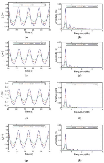 Time series of wave surface elevation and frequency spectrum at different wave steepness parameters (): (a) 0° time series of wave surface elevation; (b) 0° frequency spectrum; (c) 157.5° time series of wave surface elevation; (d) 157.5° frequency spectrum; (e) 180° time series of wave surface elevation; (f) 180° frequency spectrum; (g) 225° time series of wave surface elevation; (h) 225° frequency spectrum.