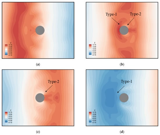 The process of wave field change around a cylinder during a wave period(plane): (a) ; (b) ; (c) ; (d) .