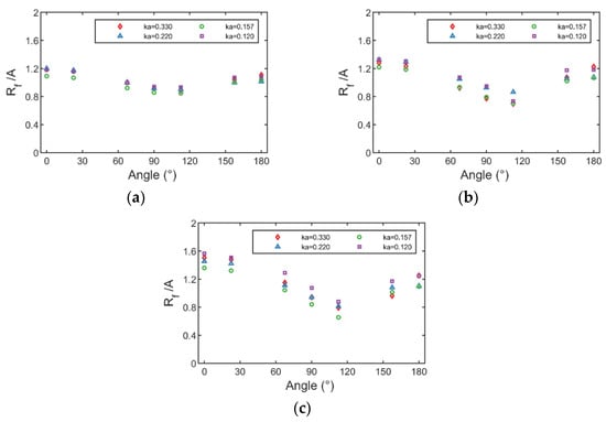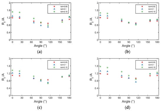 Figure 16 shows the distribution of dimensionless maximum run-up height under different scattering parameters at the same wave steepness. It can be seen that the distribution curves of dimensionless maximum run-up height under different scattering parameters have little difference at low wave steepness, and the overall trend is relatively flat. With the increase of wave steepness, the differences of dimensionless maximum run-up distribution curves of different scattering parameters increase gradually, the dimensionless run-up height in the 0° region increases gradually, the 90° region decreases continuously, the 180° region remains basically unchanged, and the distribution curve is concave. In addition, it is also found that under the same wave steepness, the dimensionless maximum run-up height distribution curve under is basically lower than that under other scattering parameters.