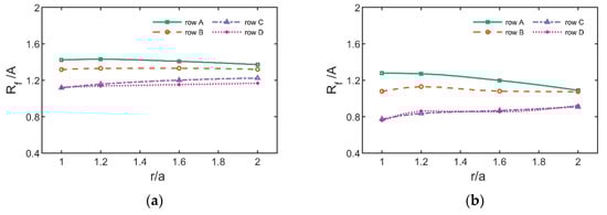 Figure 17 and Figure 18 show the distribution of dimensionless maximum wave run-up height at each radial measuring point representing the working condition (A–D column, representing 0°, 45°, 90°, and 135° directions, respectively). It can be seen that when the wave steepness is small, the dimensionless maximum run-up height around the cylinder changes little in each radial direction, and the curve is relatively flat. The distribution curve of each column is close. With the increase of the wave steepness, the nonlinearity of the wave increases, and the dispersion of each data point on the same radial distribution curve becomes larger. The deviation between the dimensionless maximum run-up height curves of each radial becomes larger, and the radial values of columns A and B decrease gradually. The values of columns C and D gradually increase along the radial direction, and the two sides form a conjugate relationship.