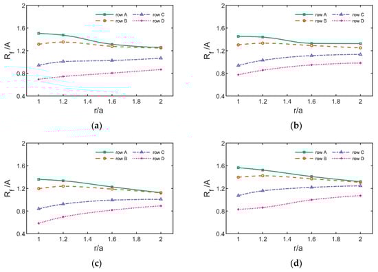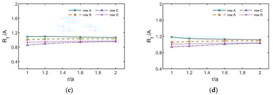 Distributions off dimensionless maximum run-up height along rows A, B, C, and D (): (a) ; (b) ; (c) ; (d) .