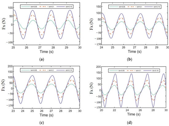 Time series of horizontal wave force on fixed cylinder under various wave conditions: (a) ; (b) ; (c) ; (d) .