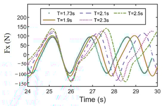 Figure 19 shows the time series curves of horizontal wave force under different wave steepnesses for each representative working condition. It can be observed that the nonlinearity of the time series curve of the horizontal wave force increases with the increase of wave steepness. Under the same wave steepness, the larger the period is, the larger the amplitude of incident wave is, the stronger the nonlinearity of the time series curve is, and the greater the wave force is. At the same time, it is also found that, with the increase of the period (wave amplitude increases), the absolute value of the peak of the horizontal wave force is less than the absolute value of the trough, and the amplitude is asymmetric, that is, the mean value of the wave force moves downward, as shown in Figure 20. It can also be seen from Figure 20 that the time series curves of wave forces in different periods are similar before the peak passes through the cylinder, but they are different after the peak passes through the cylinder. The greater the period, the stronger the nonlinearity of the time series curve, and there is a trend of secondary peaks (the second wave peak only appears when and when it is a long-wave). Rainey et al. [33] considered that the reason for the secondary loading cycle was due to the cylinder’ s obstruction of the wave peak, which caused the filling of the downstream cavity behind the cylinder.