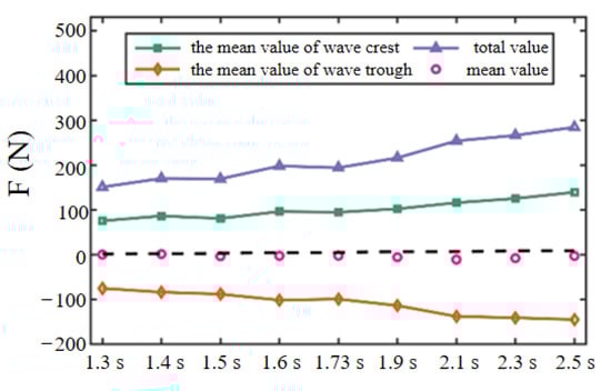 In order to further analyze this phenomenon, nine periods with wave steepnesses of 0.15 were selected to decompose the wave force, and the mean value of the wave crest, the mean value of the wave trough, the total value (the difference between the wave crest and the wave trough value) and the mean value of the time series curve are investigated, respectively. As shown in Figure 21, it can be seen that the mean value of the horizontal wave force is 0 in the short-wave cases, but with the increase of the period, in the long-wave cases, the absolute value of the wave trough is greater than the absolute value of the wave, and the horizontal wave force moves down. The reason for the above amplitude asymmetry is that, under the same wave steepness, the nonlinearity of the wave force time series curve increases with the decrease of scattering parameters, and the nonlinearity is more obvious in long-wave cases.