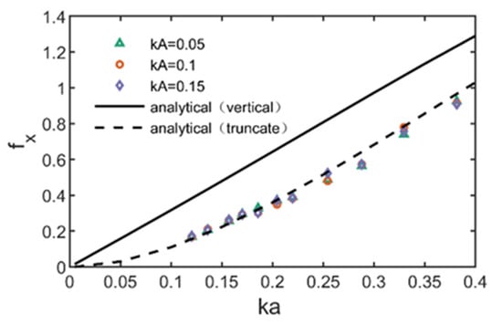 For the fixed vertical cylinder and the truncated cylinder under linear waves, the horizontal wave force on them can be obtained, respectively, according to the linear diffraction theory, as follows: