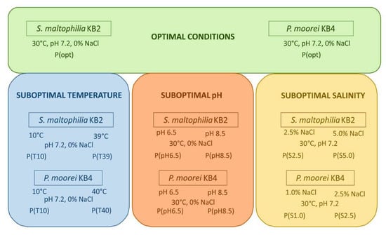 To investigate how the suboptimal circumstances, including temperature, pH, and salinity affect the phenol degradation by the tested strains, the following culture conditions were experimentally established: the lowest temperature was 10 °C, and the highest temperatures were 39 °C for S. maltophilia KB2 and 40 °C for P. moorei KB4; the extreme pH were 6.5 and 8.5, and the suboptimal concentrations of NaCl were 1.0 and 2.5% for P. moorei KB4 and 2.5 and 5% for S. maltophilia KB2. On the basis of previous studies, it was suspected that these conditions would either partially inhibit or slow down the metabolism of the bacteria [30]. A detailed diagram showing the culture conditions of both strains illustrates Figure 1. The growth of bacteria in 250 mL of mineral salt medium [43] enriched with phenol (300 mg/L) under shaking conditions (130 rpm) was measured as the culture optical density (OD600). The initial OD600 of all cultures was 0.12 ± 0.02. When floc formation occurred in a part of P. moorei KB4 cultures, the samples were carefully pipetted immediately before measuring OD600. The bacterial cells were harvested from the exponential growth phase for appropriate analysis, determined individually for each strain and specific culture conditions.