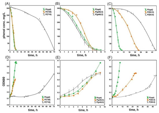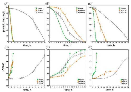Phenol degradation rates (A–C) and the growth curves of P. moorei KB4 (D–F) under different culture conditions. Abbreviations: P—phenol (300 mg/L); opt—optimal conditions, T—temperature, pH—pH value; S—salinity.