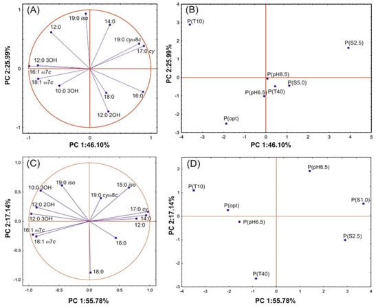 The correlation of fatty acids isolated from S. maltophilia KB2 (A) and P. moorei KB4 (C) with PC1 and PC2 and the projection of FAME profiles of S. maltophilia KB2 (B) and P. moorei KB4 (D) growing under different culture conditions on the plane defined by PC1 and PC2.