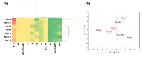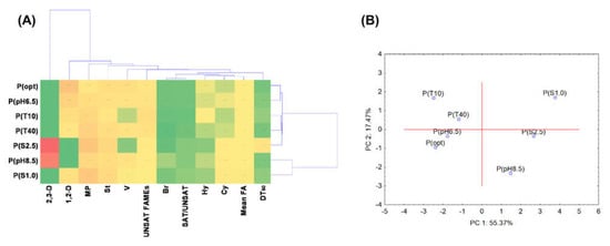 Comparing, the principal component analysis (PCA) showed that salinity (1 and 2.5%) and high pH (8.5) caused the significant changes in the fatty acid composition of P. moorei KB4 manifested in the increase in the participation of 12:0, 14:0 and 17:0 cy. The low temperature (10 °C) increased the contents of hydroxylated 10:0 3OH, 12:0 2OH, 12:0 3OH fatty acid, while the high temperature (40 °C) increased 18:0 fatty acid abundance (Figure 4C,D). Obviously, the changes found affected the ratio of SAT/ UNSAT. It was the highest (4.79 ± 0.02, 3.66 ± 0.02, and 3.77 ± 0.00) for the cells cultured under 1.0 and 2.5% salinity and pH 8.5, respectively (Table 3). The mean fatty acid chain length analysis indicated a significant increase in this parameter from 15.59 ± 0.12 for the cells cultured in optimal conditions to 16.02 ± 0.06 for the cells exposed to 40 °C and its decrease to 15.05 ± 0.06 for the cells exposed to 1.0% NaCl (Table 3).