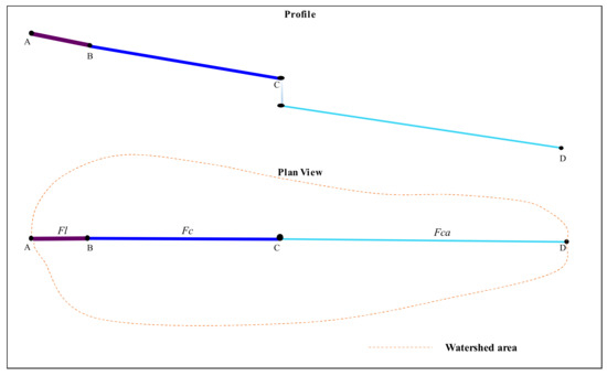The Natural Resources Conservation Service (NRCS) proposed a formula that is almost fully based on physics to estimate the time of concentration; the formula requires detailed input information for the calculation. The equation proposed by the NRCS is based on determining the travel time for sheet, concentrated and channel flow conditions [14]. Figure 1 presents the plan and side views of the locations where these three types of flows occur. Sheet flow (Fl) occurs at the headwaters of a basin, concentrated flows (Fc) arise immediately after the sheet flow, and channel flow (Fca) takes place in the drainage channel. Figure 2 displays the differences between the concentrated flow and the channel-type flow, using as reference the behavior of one of the small watersheds of the study following a rainfall event.