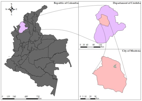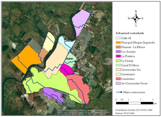 The small urban watersheds of the study are located in the city of Montería, department of Córdoba, Colombia (see Figure 3). It covers an area of approximately 3142 km2 and its topography is basically flat with a few elevations. The city is surrounded by numerous creeks and streams, and the city’s main water source is the Sinú River. The region has a rainy season between April and September and a dry season between December and April. The city of Montería has an average slope of 0.2%, and a rainfall drainage system that starts out on the streets as a concentrated flow, and whose superficial runoff is subsequently fed into a drainage channel.