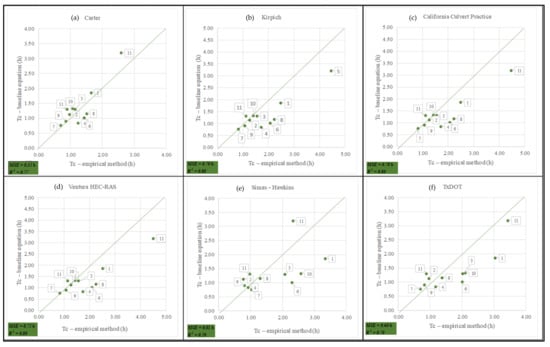 Tc graphs estimated with empirical methods versus Tc calculated with the baseline equation: (a) Carter; (b) Kirpich; (c) California Culvert Practice; (d) Ventura; (e) Simas-Hawkins; and (f) TxDOT.