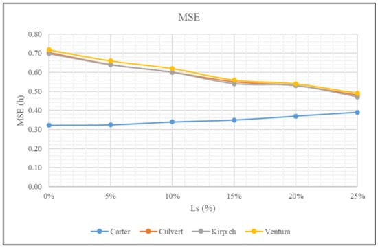 Figure 7. Calculation of MSE changing Ls. - With the equations by Kirpich and California Culvert Practice, as Ls decreases, MSE decreases. Using the same criteria of analysis used for Carter’s equation, it was found that when Lsi = 0.75 Ls, MSE = 0.48 h for both equations. Similar results were found with the Ventura equation: when Lsi = 0.75 Ls, MSE = 0.49 h.