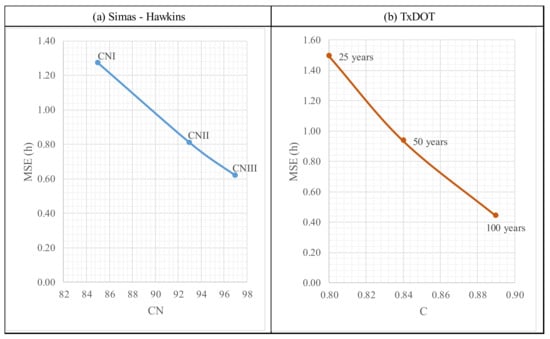 Figure 8. Calculation of MSE changing CN and C: (a) Simas-Hawkins; and (b) TxDOT. - When the weighted runoff coefficient (C) was sensitized in the equation by TxDOT, it was found that as the C value increases as a function of the return period [19], MSE decreases, in which the value found for a return period of 100 years is the one with best goodness of fit (MSE = 0.44 h), see Figure 8b.