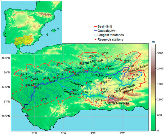 Location of the Guadalquivir River Basin in the southern Iberian Peninsula. Designation of reservoir stations and their spatial distribution in the Guadalquivir River basin. Altitude in meters is represented with a color scale, and longest tributaries and main mountain ranges are located in the map.