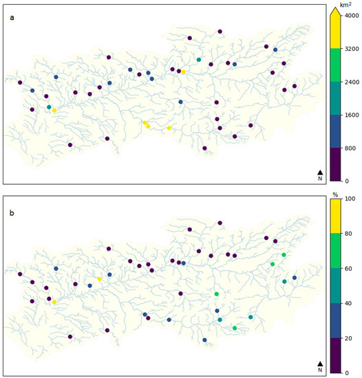 (a) Catchment area of each station in km2, capped at 4000 km2. (b) Percentage of permeable soil in the catchment basin of each station.