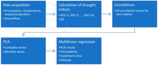After computing correlations, a principal component analysis (PCA) was performed in order to analyze the different spatial patterns of correlation between the SSI and the SPEI at different time scales. PCA is widely used in climate research to find patterns in the data from a complex dataset [36,37]. The purpose of this PCA was to check if the basin could be divided in sub-basins with similar hydrological responses. It was performed using both the continuous series and the monthly series, and the divisions were made using the PCA scores and loadings.