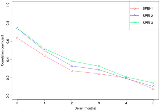 When correlating the indices, it was considered that soil memory could introduce a delay in the correlation values between SPEI and SSI [41]. This situation would be particularly interesting for short accumulation periods. Figure 4 shows the correlation between SPEI and SSI for station 5018 (located to the northeastern area) accounting with different SPEI delays and accumulation periods. As can be seen, correlation decreases as the delay increases in this station for all accumulation periods. The same effect appeared in all stations of the basin. This is in accordance with the results of Koster and Suarez [10], where it is shown that the value of this lag is between 1 and 2 months in arid and semi-arid regions. The fact that the data used in this study are monthly accumulated instead of daily explains that correlations are higher for simultaneous SPEI and SSI series.