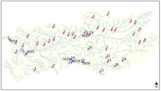 Once the effect of soil memory was checked, propagation from meteorological to hydrological drought was analyzed. It was discovered that the studied stations have different behaviors in their correlations. Figure 5 shows the SPEI accumulation period for which correlations between SSI and SPEI reach the maximum value. As can be seen, maximum correlations occur at short accumulation periods (around 2 or 3 months) for most stations. There are, however, several exceptions. Most notably, stations 5019 and 5025, located in the south, and 5032, in the center, show that maximum correlations appear with large accumulation periods of 24 months. This is the first sign of the special treatment that these three stations require, which will be discussed later in this study. This differentiation is required because of their distinct physical characteristics, mainly their catchment area, larger than 4000 km2, as shown in Figure 2a.