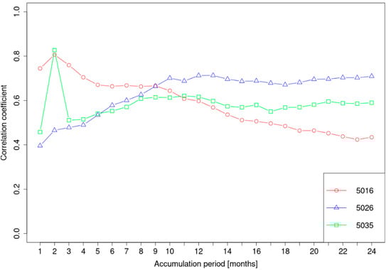 Three detailed examples of the evolution of correlation with the accumulation period are shown in Figure 6. Station 5016 is the westernmost station in the study area (Figure 1), and it is located in the header of its sub-basin, so it has no upstream regulation. Its correlation peak appears in the 2-month accumulation period, and it decreases thereafter. The explanation for this behavior is that the catchment area is small and relatively irregular, causing water from precipitation events to rapidly find the stream. Station 5026 is located in the center and southern part of the Guadalquivir basin, and it has one of the largest catchment areas (Figure 1 and Figure 2a). It shows a peak for the 13-month accumulation period. Note that, for this station, a significant part of its inflow comes from Sierra Nevada, which means that its streamflow is delayed and influenced by precipitations-snow-of several previous months. Lastly, station 5035, located in the northwestern part of the basin, is shown here since it presents a particular feature, with a local maximum in the 2-month accumulation period. However, its correlation later grows between the 3 and the 12-month accumulation periods.