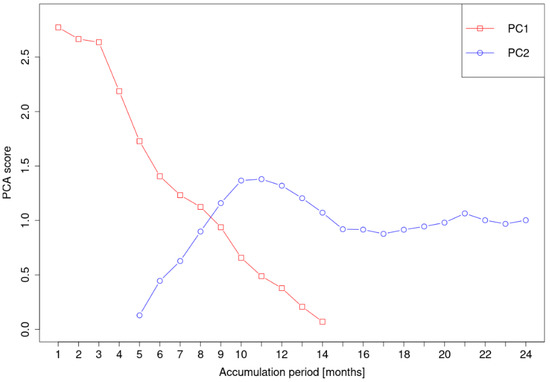 Scores of the two principal components obtained in the monthly series analysis for each accumulation period (1–24).