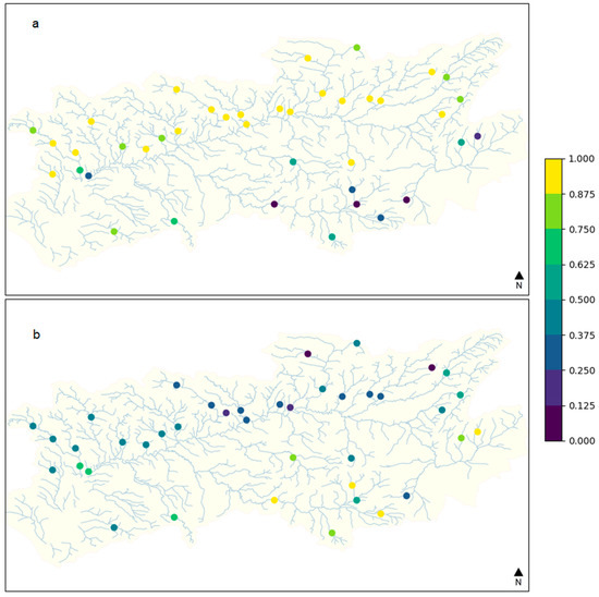Principal component loadings show that there is a clear distinction between north and south in the Basin, with Guadalquivir River as the dividing line. Northern stations are generally represented by PC1 (Figure 8a), while southern stations, with some exceptions, present higher PC2 loadings (Figure 8b).