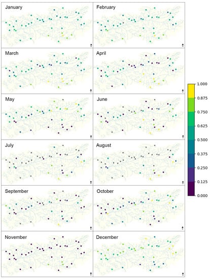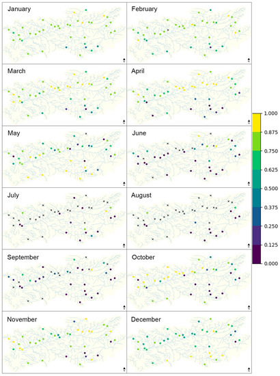 In addition to the analysis of the continuous series, another PCA was performed on the twelve monthly series. These twelve PCAs were performed with two principal components each. The percentage of total variance represented by the first two rotated PCs ranges from 66% (September) to 98% (January). The specific value for each month appears in Figure 9 and Figure 10 for PC1 and PC2, respectively. There are some stations where the streamflow dataset had monthly gaps, mostly during the summer months. These gaps are provoked most probably due to errors in the stream gauging stations, due to the low or inexistent streamflow during those months. For such stations, the results of the monthly PCA were not reliable enough, so they were marked with crosses in Figure 9 and Figure 10, and excluded from this analysis.
