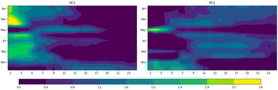 Figure 11 shows the scores of both principal components regarding the accumulation period. At monthly scale, it is clear that, except for May and December, PC1 is representative of stations with low accumulation periods, while PC2 is related to longer accumulation periods. This is similar to the result that appeared in the continuous series analysis. Figure 9 and Figure 10 show the corresponding loadings for every month.